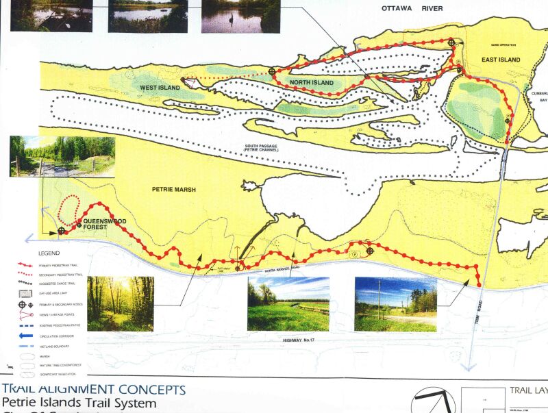 The City of Cumberland in cooperation with the Regional Municipality of Ottawa‑Carleton (RMOC) and the Friends of Petrie Island has carried out a study to establish a system of interpretive walking trails for the Petrie Islands area and the adjacent mainland shoreline. The study was undertaken in order to establish a course of action which, when implemented, would afford the public an opportunity to enjoy the scenic natural beauty of this part of the Cumberland waterfront without negatively impacting on the surrounding environment. When complete, there will be two main interpretive trails. The Shore Trail will be located along the foot of the wooded slope north of the North Service Road between the Tenth Line Road and Trim Road. The Island Trail is a loop‑back trail which will be located on the main island starting within and running west from the existing picnic area.